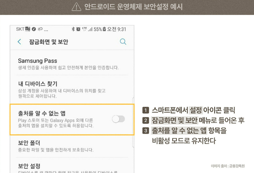 - 스마트폰의 “출처를 알 수 없는 앱” 설치 차단 기능을 반드시 비활성화해두세요.