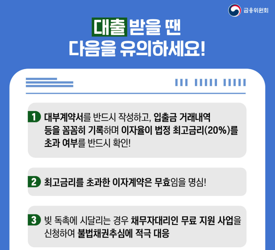 - 전화상담: 불법사금융피해신고센터 ☎ 1332-3 (국번 없음)