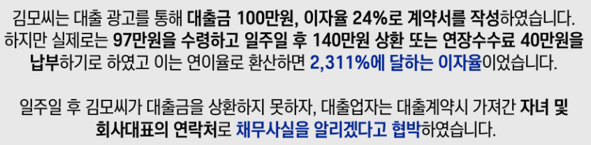 예를 들어, 500만 원을 빌리는데 실제 수령액은 470만 원, 상환 총액이 680만 원이라면 연 이율은 무려 300%에 달합니다.