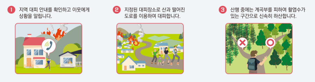 산불이 다가오면 즉시 대피 안내에 따르고, 산에서 멀리 떨어진 안전한 장소로 이동합니다. 산행 중이라면 계곡을 피하고, 활엽수가 많은 구간을 따라 신속히 이동합니다. 야영 중일 경우에도 산불 확산 구역과 멀리 떨어진 도로를 따라 대피해야 합니다.
