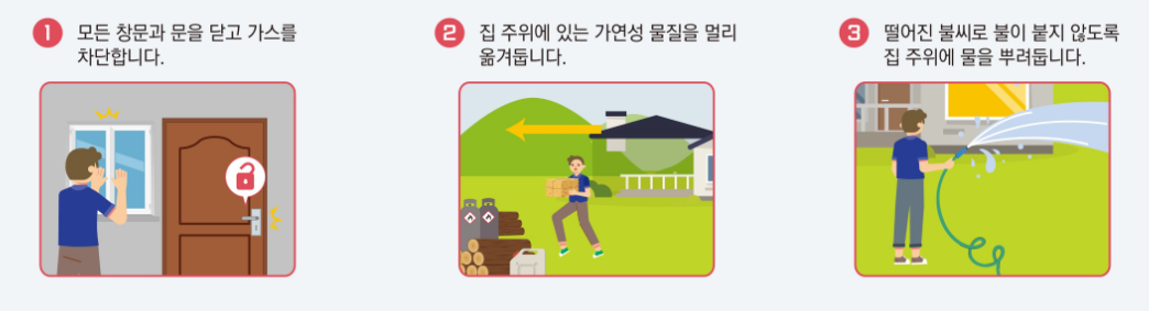 집 주변의 가연성 물질을 제거하고, 불씨가 옮겨붙는 것을 방지하기 위해 집 주변에 물을 뿌려둡니다. 외부 조명을 켜두어 연기 속에서도 소방관이 위치를 확인할 수 있게 하고, 대피 준비가 필요할 시 차량을 진입로 근처로 이동시킵니다.