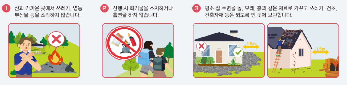 산불은 주거 지역으로도 확산될 수 있습니다. 따라서 집 주변은 불연성 재료로 정비하고, 큰 식물이나 덤불 대신 작은 식물을 가꾸며, 지붕이나 테라스에 쌓인 낙엽과 가지는 주기적으로 정리합니다. 또한, 가연성 물질은 집에서 멀리 떨어진 곳에 보관하여 불씨가 옮겨붙는 것을 방지해야 합니다.
