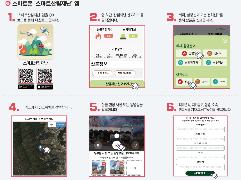 산불 관련 신고는 스마트폰 ‘스마트산림재난’ 앱을 통해 쉽고 빠르게 할 수 있습니다. 예방과 신고의 실천으로 우리의 산과 소중한 생명을 지켜봅시다.