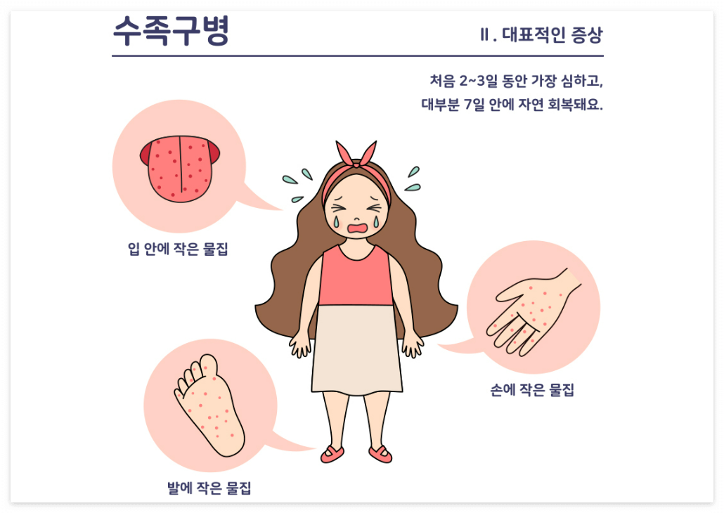 수족구병은 손, 발, 입 안에 물집이 생기는 바이러스성 질환입니다. 주로 5세 이하 영유아에게 발생하며, 여름과 가을철에 흔히 나타납니다.