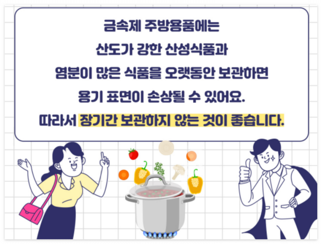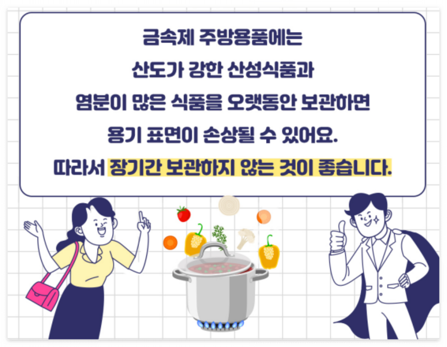 스테인리스 조리기구는 오래 보관할 때도 신경 써야 합니다. 특히 산성식품이나 염분이 많은 음식을 금속 용기에 장시간 보관하면 표면이 손상될 수 있습니다.