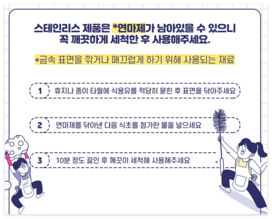 스테인리스 제품은 제조 과정에서 연마제가 남아 있을 수 있으므로 처음 사용할 때 반드시 깨끗하게 세척하는 것이 중요합니다.