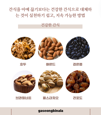간식을 아예 끊기보다는 건강한 간식으로 대체하는 것이 실천하기 쉽고, 지속 가능한 방법입니다.