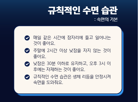 - 수면 환경 개선: 수면의 질을 높이기 위해 어두운 환경, 적절한 온도, 편안한 침구 등을 사용해 수면 환경을 개선하세요.