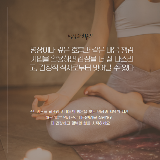 - 마음 챙김: 명상이나 깊은 호흡과 같은 마음 챙김 기법을 활용하면 감정을 더 잘 다스리고, 감정적 식사로부터 벗어날 수 있습니다.