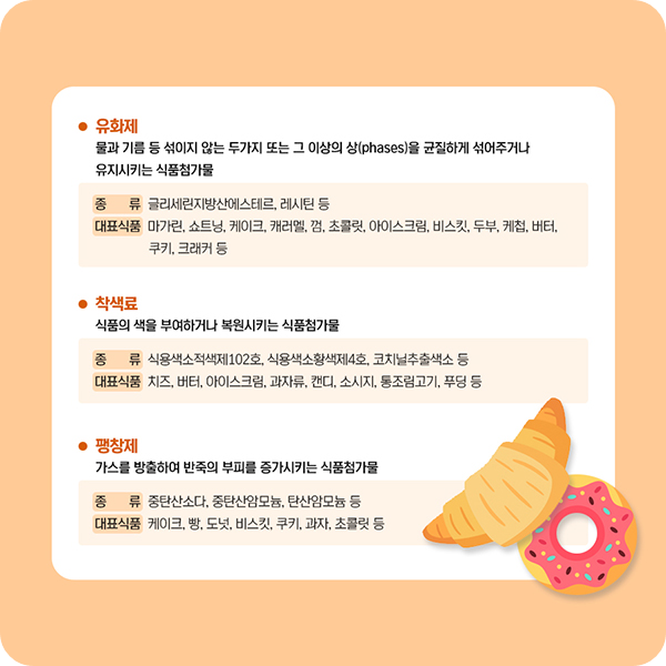 물과 기름등 섞이지 않는 두가지 또는 그 이상의 상(phases)을 균질하게 섞어주거나 유지시키는 식품첨가물