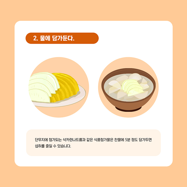 단무지에 첨가되는 삭카린나트륨과같은 식품첨가물은 찬물에 5분 정도 담가두면 섭취를 줄일 수 있습니다.