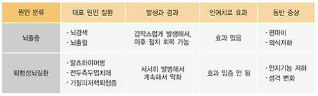 반면, 퇴행성 뇌질환에 의한 실어증은 서서히 진행되며, 원인이 되는 뇌질환을 찾는 것이 중요합니다. 이를 원발진행실어증이라고 하며, 치매와 관련된 뇌 기능 손실이 주로 원인이 됩니다.