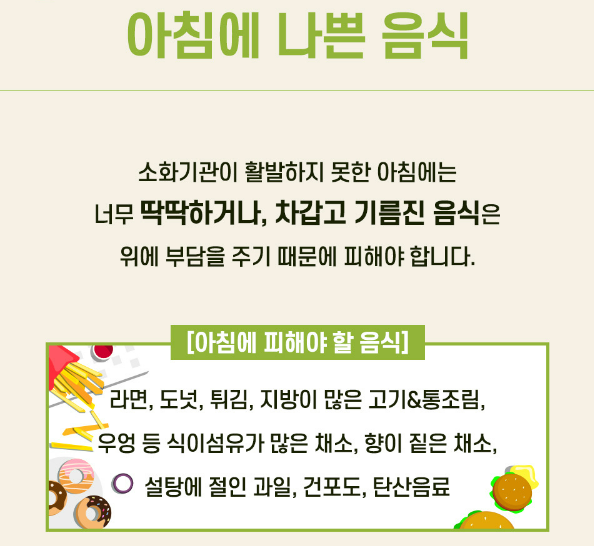 아침에는 소화기관이 완전히 활성화되지 않았기 때문에, 딱딱하거나 차갑고 기름진 음식은 소화에 부담을 줄 수 있습니다. 또한 식이섬유가 지나치게 많은 음식도 아침에는 피하는 것이 좋습니다.