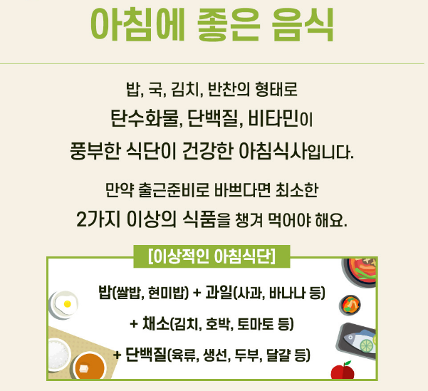 아침식사는 다양한 영양소를 골고루 섭취할 수 있는 균형 잡힌 식단이 이상적입니다. 밥, 국, 김치, 그리고 단백질이 풍부한 반찬으로 구성된 식단이 대표적인 건강한 아침식사입니다. 만약 아침이 너무 바빠 정식을 챙기기 어렵다면, 최소한 2가지 이상의 음식을 섭취하는 것이 좋습니다.