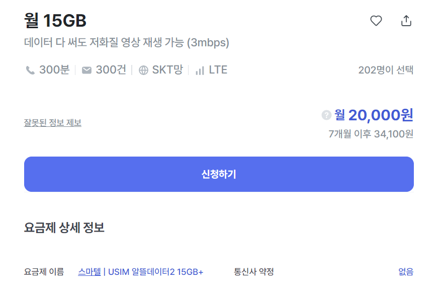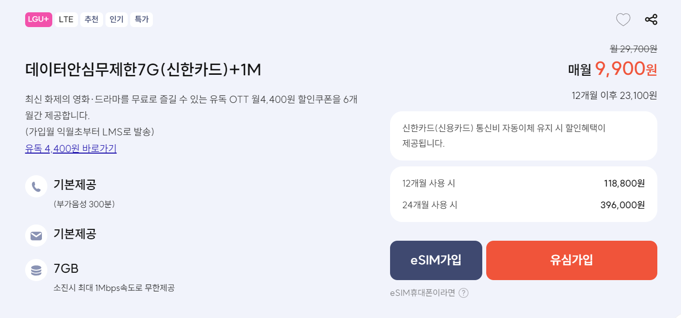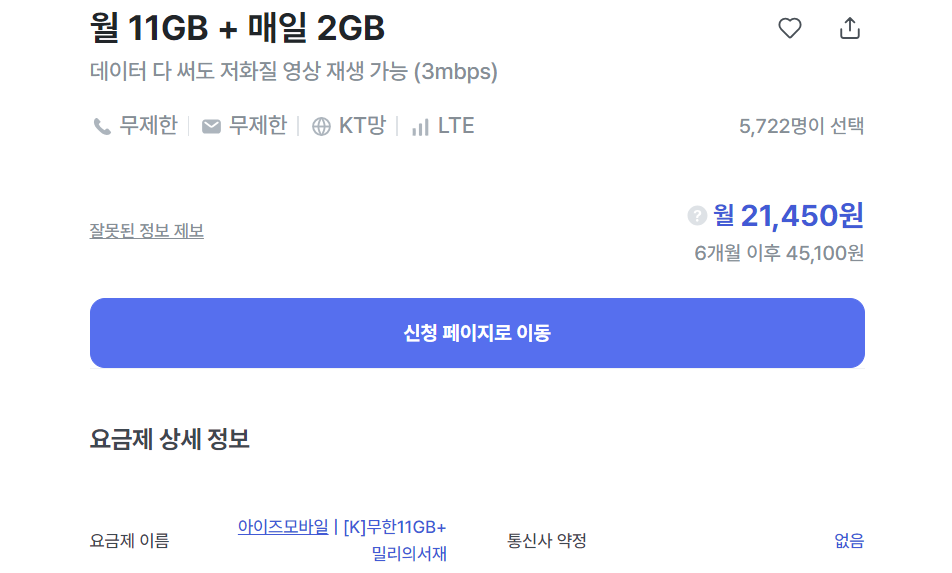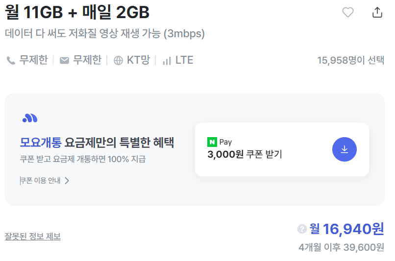 - 데이터: 월 11GB + 매일 2GB (이후 3Mbps 속도)
