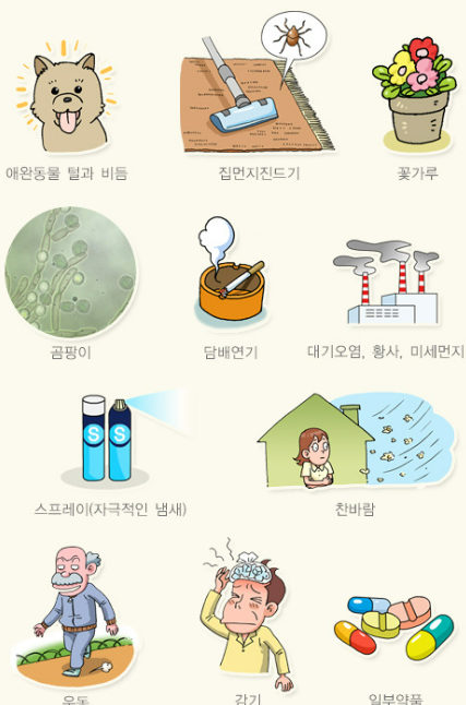 - 천식: 기관지에 염증이 생겨 호흡 곤란을 유발합니다.