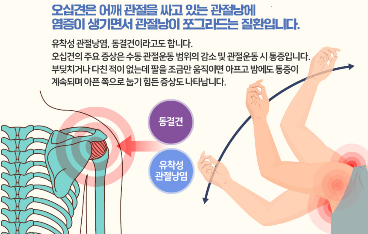 오십견은 어깨 관절 주변의 염증으로, 통증, 뻣뻣함, 운동 제한 등의 증상이 나타나는 질환입니다.