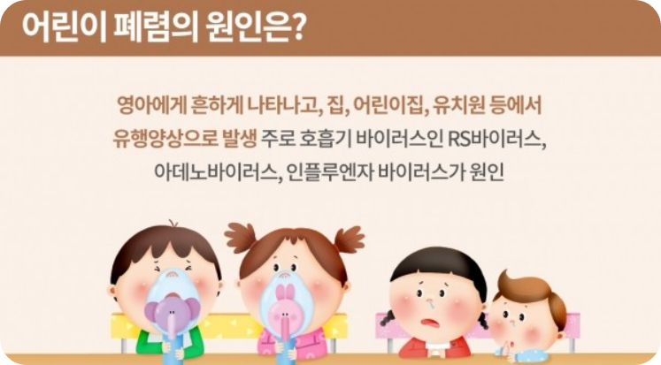 1)바이러스성 폐렴: RSV(호흡기 세포융합 바이러스), 인플루엔자 바이러스, 아데노 바이러스 등이 주요 원인입니다.
