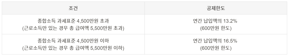 - 소득이 4,500만원 초과: 연간 납입액의 13.2% (최대 600만원 한도)