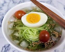- 위 사진은 콩나물, 계란, 김 등을 넣고 끓인 오이 국수입니다. 얼음을 넣어 더욱 시원하게 즐기세요.