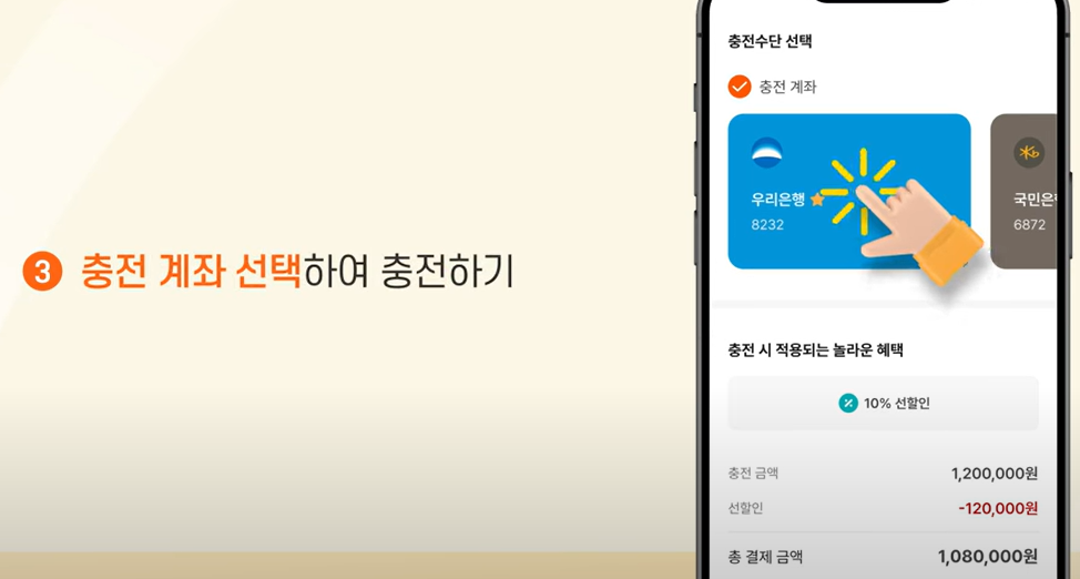 - 앱 홈 화면 **'충전하기'**에서 금액과 충전 계좌 선택