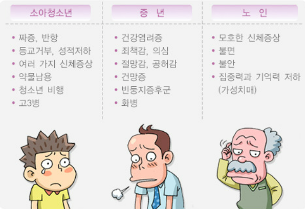 - 신체적 증상: 식사장애, 수면 패턴의 변화, 피로감, 통증 등 다양한 신체 증상이 나타납니다.