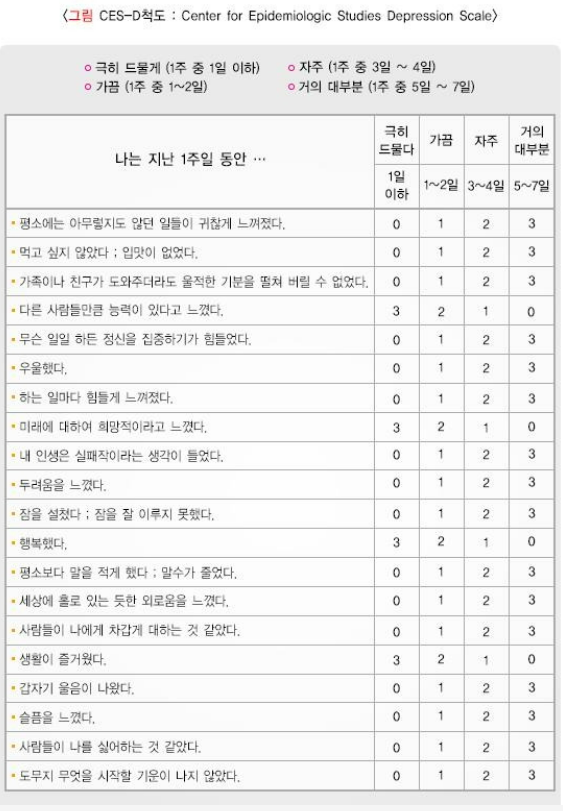 CES-D 척도(Center for Epidemiologic Studies-Depression Scale, CES-D Scale): 우울증의 선별검사 및 자가진단에 가장 많이 사용되는 척도로 총 20개 문항으로 구성됩니다. 총점 16점 이상이면 경도, 21점 이상이면 중등도, 25점 이상이면 중증 우울 증상을 의심하여 전문가와의 상담이 필요합니다.