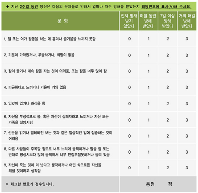 PHQ-9(Patient Health Questionnaire-9, PHQ-9): DSM-5의 주요 우울증 진단기준에 해당하는 9항목 자가 보고식 설문지입니다. 총점 9점 이상이면 우울증을 의심해 전문가와의 상담이 필요합니다.