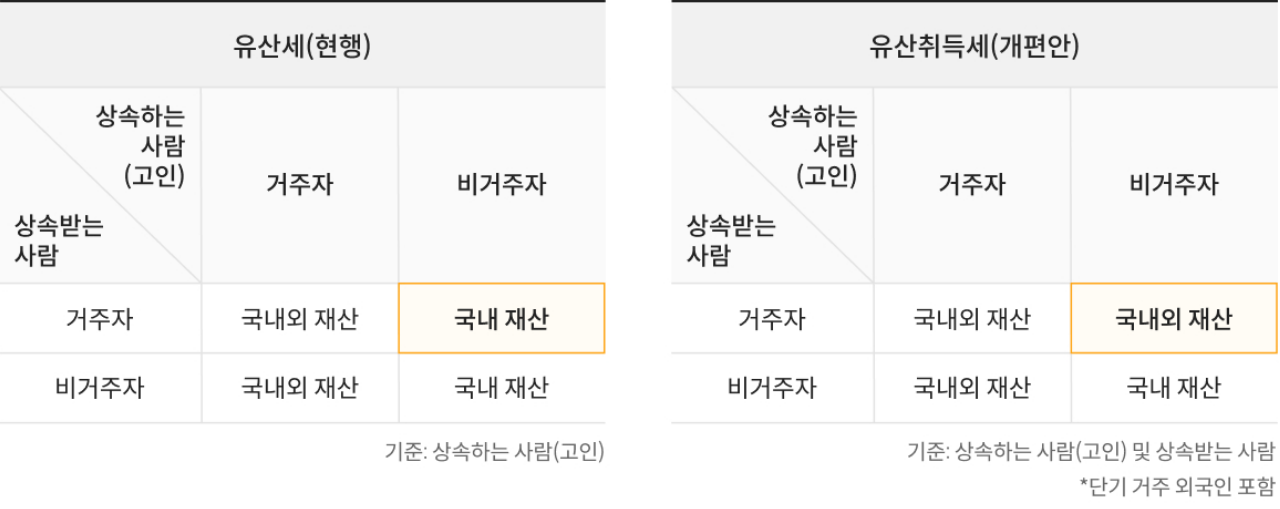 - 현행: 사망자가 국내 거주자면 국내·외 모든 재산에 세금 부과. 비거주자면 국내 재산만 과세.