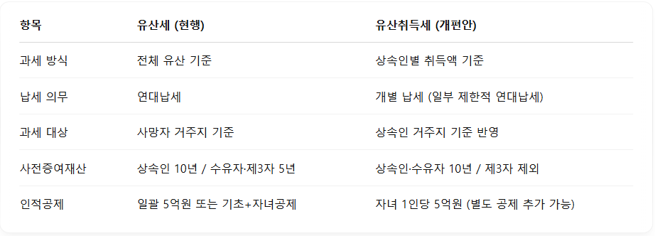 정부는 2025년 3월 상속세 제도를 유산취득세 방식으로 전환하는 개편안을 발표했어요. 법 개정 절차를 거쳐 시행 시점이 확정될 예정이니, 추후 공식 발표를 꼭 확인해야 합니다.