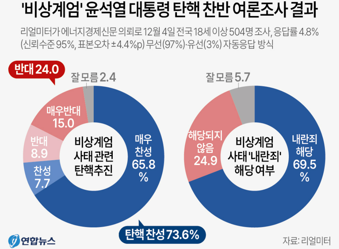 - 찬성 여론: 여론 조사에서 73%가 탄핵 찬성 의견을 표명했고, 특히 2030 세대와 수도권에서 강한 지지를 보였습니다.