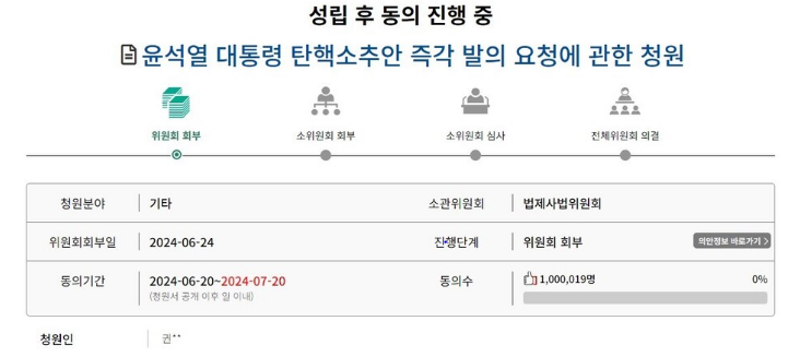 지난 6월 20일, 국회 국민동의청원 웹사이트에 '윤석열 대통령 탄핵소추안 즉각 발의 요청에 관한 청원'이 등록되었습니다. 이 청원은 등록 후 빠른 시간 내에 대규모의 동의를 받으며 주목받고 있습니다.
