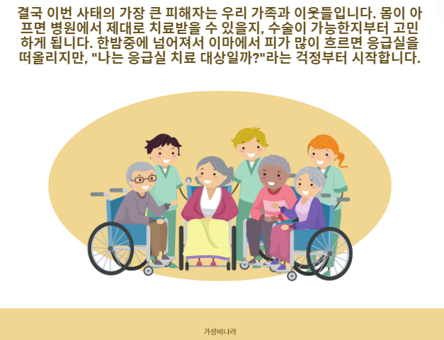 결국 이번 사태의 가장 큰 피해자는 우리 가족과 이웃들입니다. 몸이 아프면 병원에서 제대로 치료받을 수 있을지, 수술이 가능한지부터 고민하게 됩니다. 한밤중에 넘어져서 이마에서 피가 많이 흐르면 응급실을 떠올리지만, "나는 응급실 치료 대상일까?"라는 걱정부터 시작합니다.