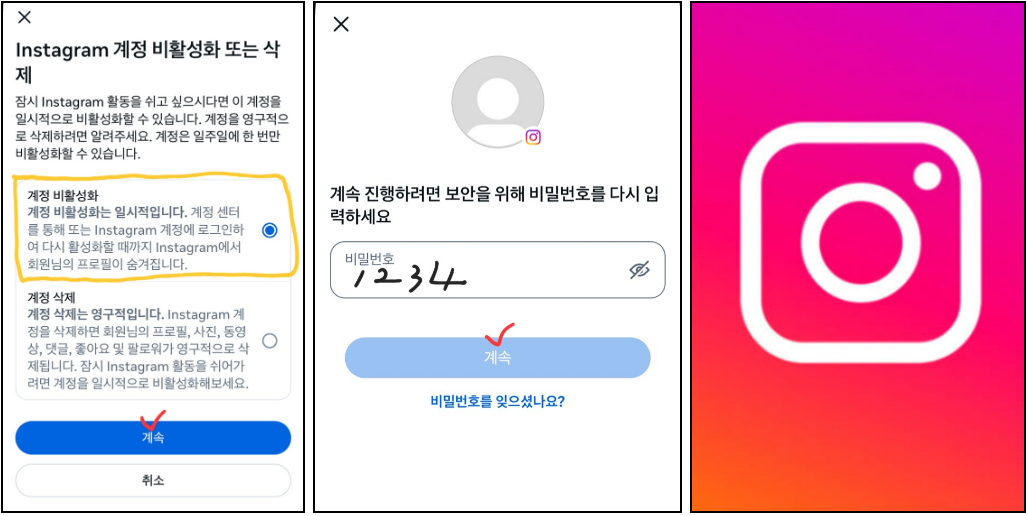 이 과정을 통해 인스타그램 계정을 비활성화할 수 있으며, 언제든지 다시 로그인하면 계정이 복구됩니다!