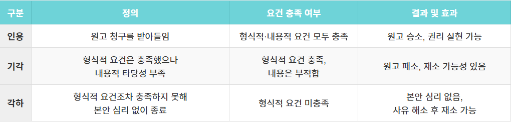 - 각하: 소송 자체가 부적법하여 본안 심리 없이 종료