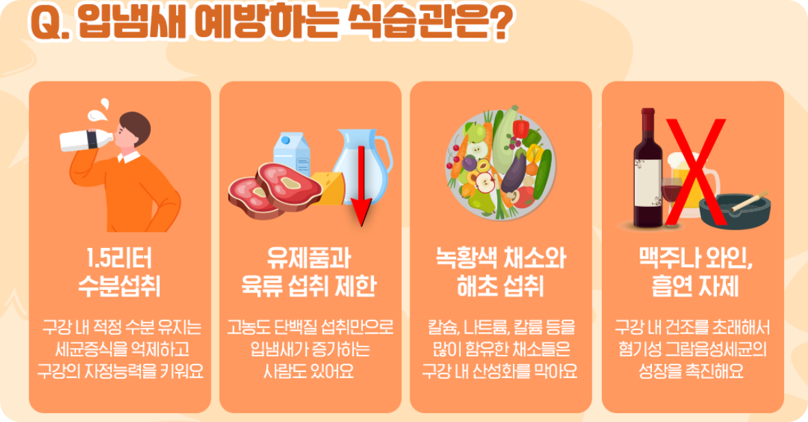 - 균형 잡힌 식사: 과일과 채소를 충분히 섭취해 구강 내 박테리아의 성장을 억제합니다.