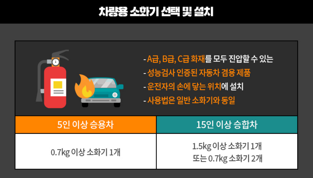 2024년 12월 1일 이후에 제작되거나 수입된, 그리고 판매되는 모든 5인승 이상 차량에는 소화기를 반드시 비치해야 합니다. 이는 대형 SUV, 미니밴, 승합차 등 5명 이상의 승차 인원이 있는 모든 차량에 적용됩니다.