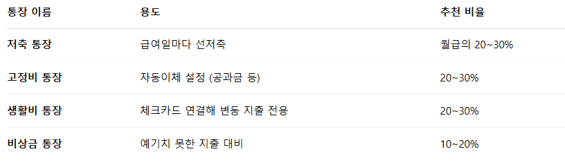 A. 지출 목적에 따라 통장을 나누면 소비 통제가 쉬워지고, 비상 상황에도 유연하게 대응할 수 있습니다. 저축/고정비/생활비/비상금 통장을 각각 운용하면 각 용도의 자금 흐름을 명확히 파악할 수 있어요.
