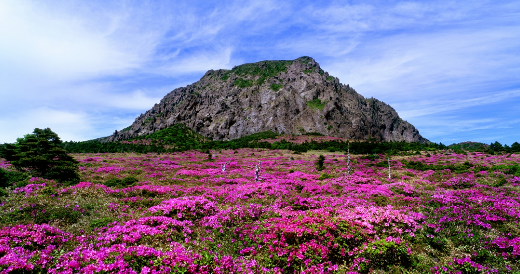 한라산은 봄과 여름의 경계에서 철쭉이 만개하며 분홍빛으로 물듭니다. 특히 해발 1,600m의 선작지왓은 철쭉이 가장 많이 피는 곳으로, 영실 코스를 따라 병풍바위와 오백 개의 암봉 앞에 펼쳐진 철쭉 군락지는 한라산의 대표적인 장관 중 하나입니다.