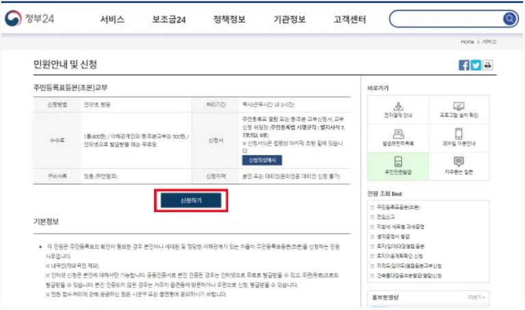 주민등록표등본(초본) 교부페이지에서 신청하기 버튼 클릭