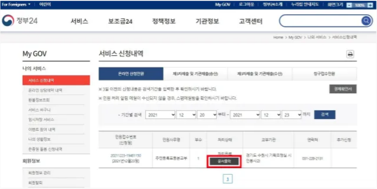 주민등록등본 발급 완료 시, 주민등록등본 발급내역 페이지로 이동합니다. 문서 출력 버튼을 클릭합니다.