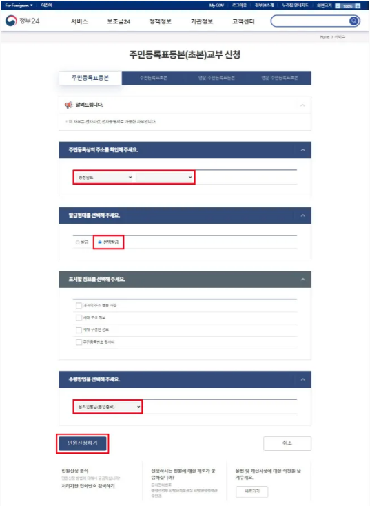 주민등록상 주소 지역, 발급형태 선택발급, 수령방법 온라인발급(본인출력) 선택 후 민원신청하기 버튼 클릭