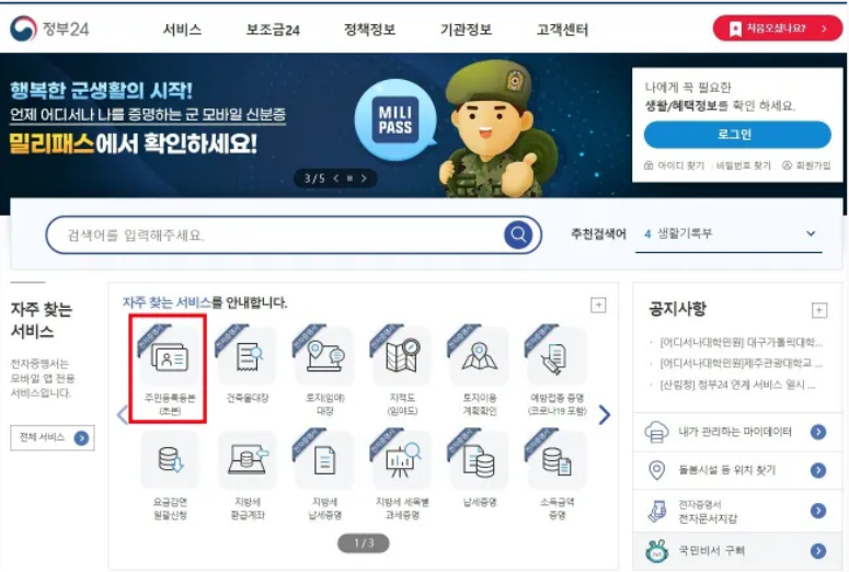 - 메인 화면에서 "자주 찾는 서비스"를 클릭하고 "주민등록등본(초본)"을 선택합니다.
