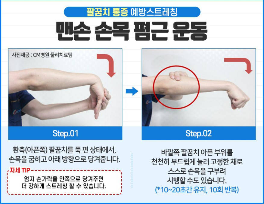 - 스트레칭: 팔꿈치와 손목을 스트레칭하여 유연성을 유지합니다.