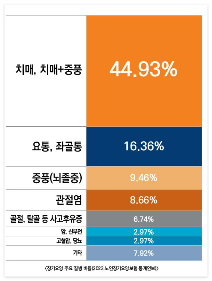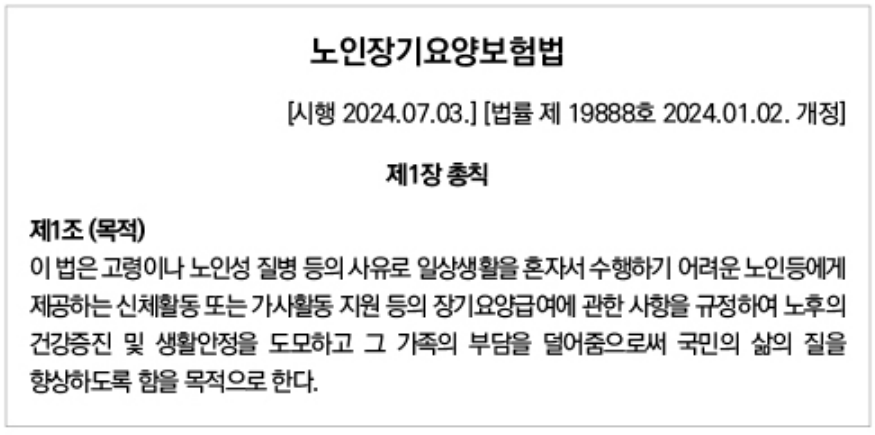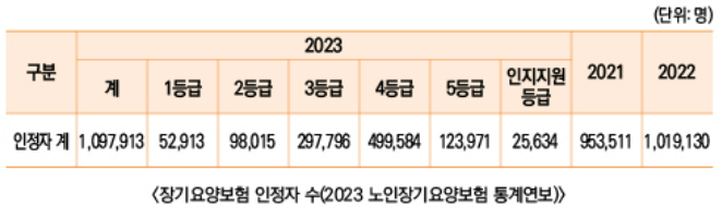 - 지원 대상: 65세 이상 노인이나, 65세 미만이라도 치매나 뇌혈관질환과 같은 노인성 질병이 6개월 이상 지속돼 일상생활이 어려운 경우.