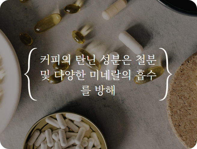 흡수 방해: 커피의 탄닌 성분은 철분 및 다양한 미네랄의 흡수를 방해할 수 있습니다. 이는 철분 보충제나 기타 미네랄 보충제를 커피와 함께 섭취할 때 특히 문제가 됩니다.