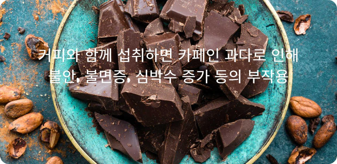 카페인 과다 섭취: 초콜릿, 특히 다크 초콜릿에는 카페인이 함유되어 있습니다. 커피와 함께 섭취하면 카페인 과다로 인해 불안, 불면증, 심박수 증가 등의 부작용이 나타날 수 있습니다.