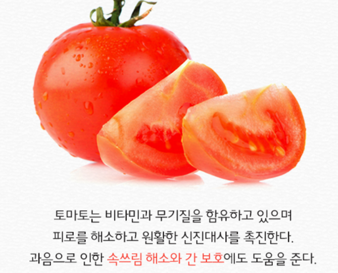 토마토에는 피로 회복에 도움이 되는 비타민 B1, B6, 엽산 등이 풍부하게 함유되어 있습니다. 또한 토마토에 풍부한 칼륨은 체내 나트륨 배출을 촉진하여 숙취 해소에도 효과적입니다.