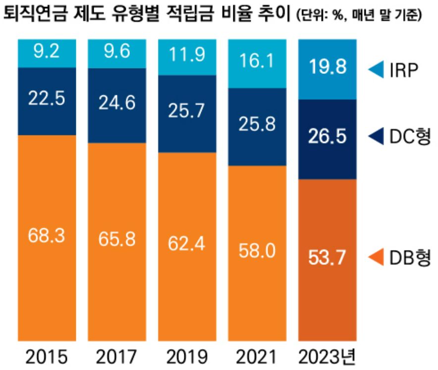 DB형 퇴직연금의 적립금 비율은 2015년 68.3%에서 2023년 53.7%로 감소했으며, DC형 퇴직연금의 비율은 22.5%에서 26.5%로 상승하는 추세입니다. 특히 고령화와 저성장에 따른 임금 상승률 둔화와 더불어 근로자의 자산 관리 능력에 대한 신뢰가 높아지면서 DC형 퇴직연금으로의 전환이 증가하고 있습니다.