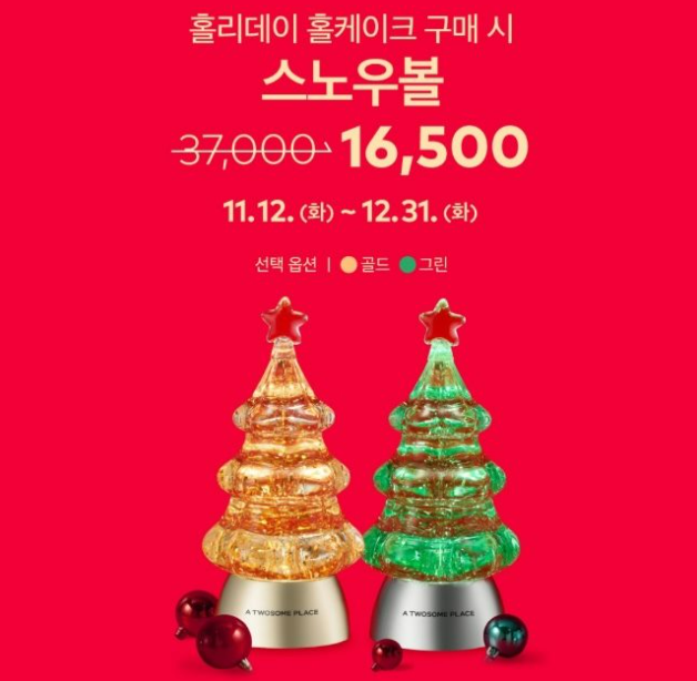 2024년 크리스마스를 맞아 특별한 스노우볼(스노우트리)을 구매할 수 있는 기회가 있어요. 바로 홀리데이 홀케이크를 구매하면, 스노우볼을 16,500원에 추가 구매할 수 있답니다! (정상 가격: 37,000원)